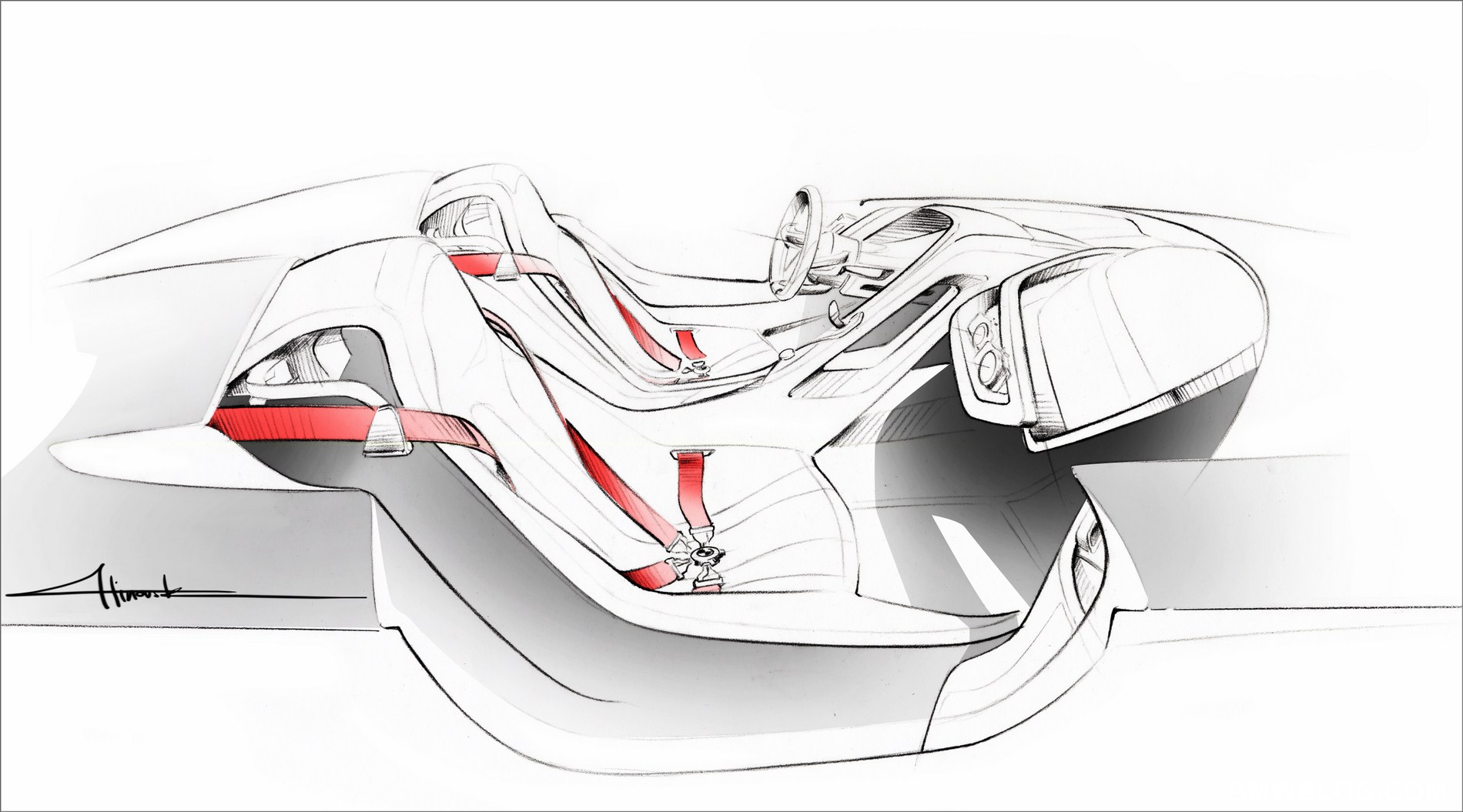The second layer begins next to the scoop, making a sweep towards the co- driver, then to float freely in front of him. This gesture creates a sporty but light sense of spaciousness, opening out a functional area in front of the co-driver. Between the driver and co-driver a multitude of recesses in the instrument panel and centre console create an airy and harmonious spatial experience, bringing the driver and the co-driver slightly closer to each other again in a sweeping gesture. The lines of the woven carbon fibres complement the interior design vocabulary perfectly.
