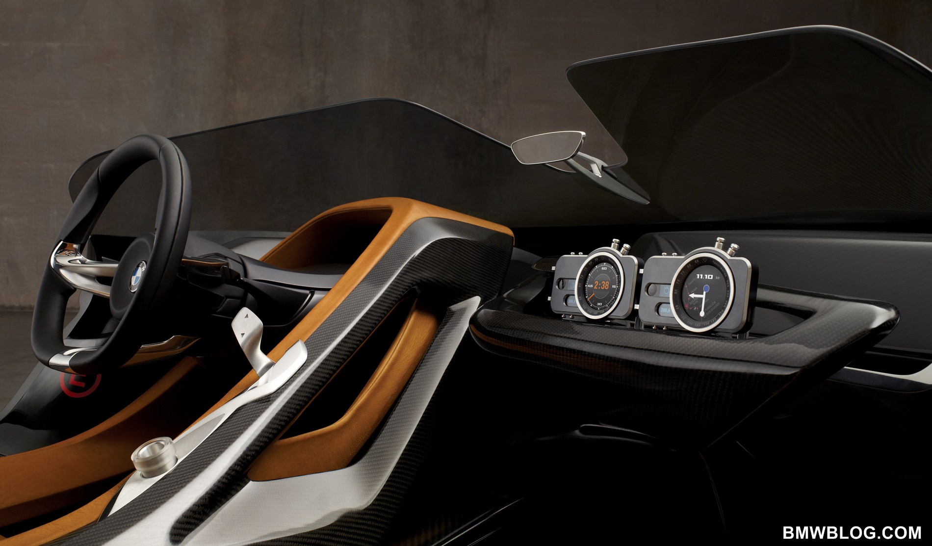 Through the use of CFRP inside the BMW 328, the “layering” design principle, with which shapes take on clear functions, adopts a completely new form of expression. Due to its exceptional characteristics, CFRP is in itself robust and can be shaped into self-supporting structures. Hence, only two large surface areas – so-called layers – define the interior of the BMW 328 Hommage. Both of them start at the bonnet and protrude into the interior. One of the layers extends to- wards the driver, reveals the entire driver’s workplace comprising steering wheel, control elements and scoop, thereby separating the driver and co-driver areas from each other. This spatial separation is indicated by a further material: the elegant, brown leather interior extends from the entrance across the driver’s area, over the seats to the scoop, thus becoming an integral part of the design vocabulary of the first layer. At the same time, the surrounding graphics comprising material and geometry create a link with the co-driver. On the driver’s scoop, a silver-coloured logo bearing the number 75 also gives indication inside the car of the festive occasion in honour of the BMW 328 Hommage.