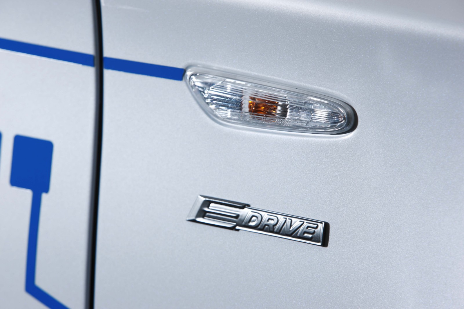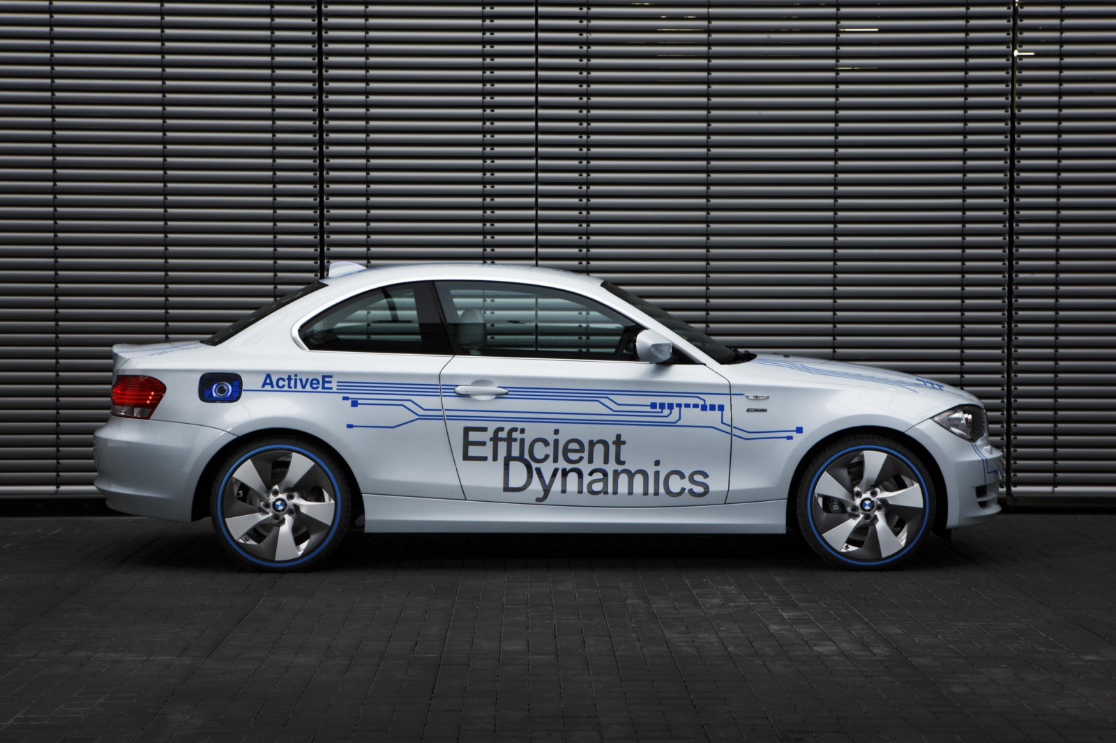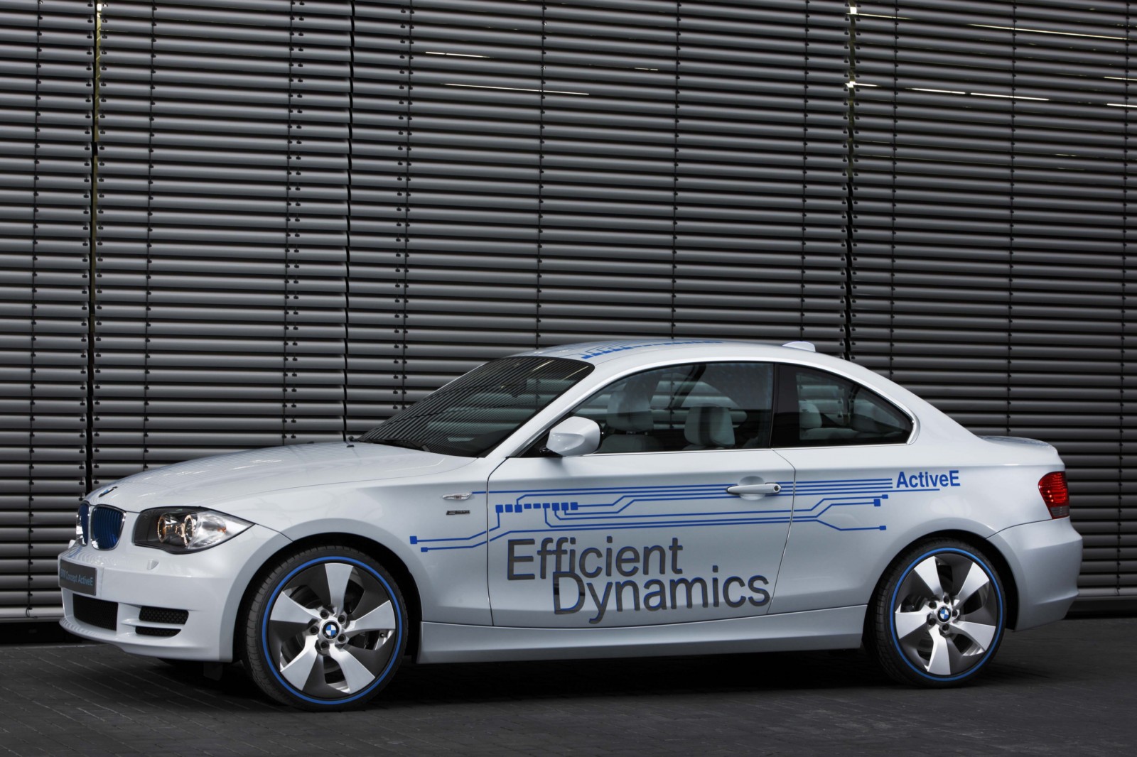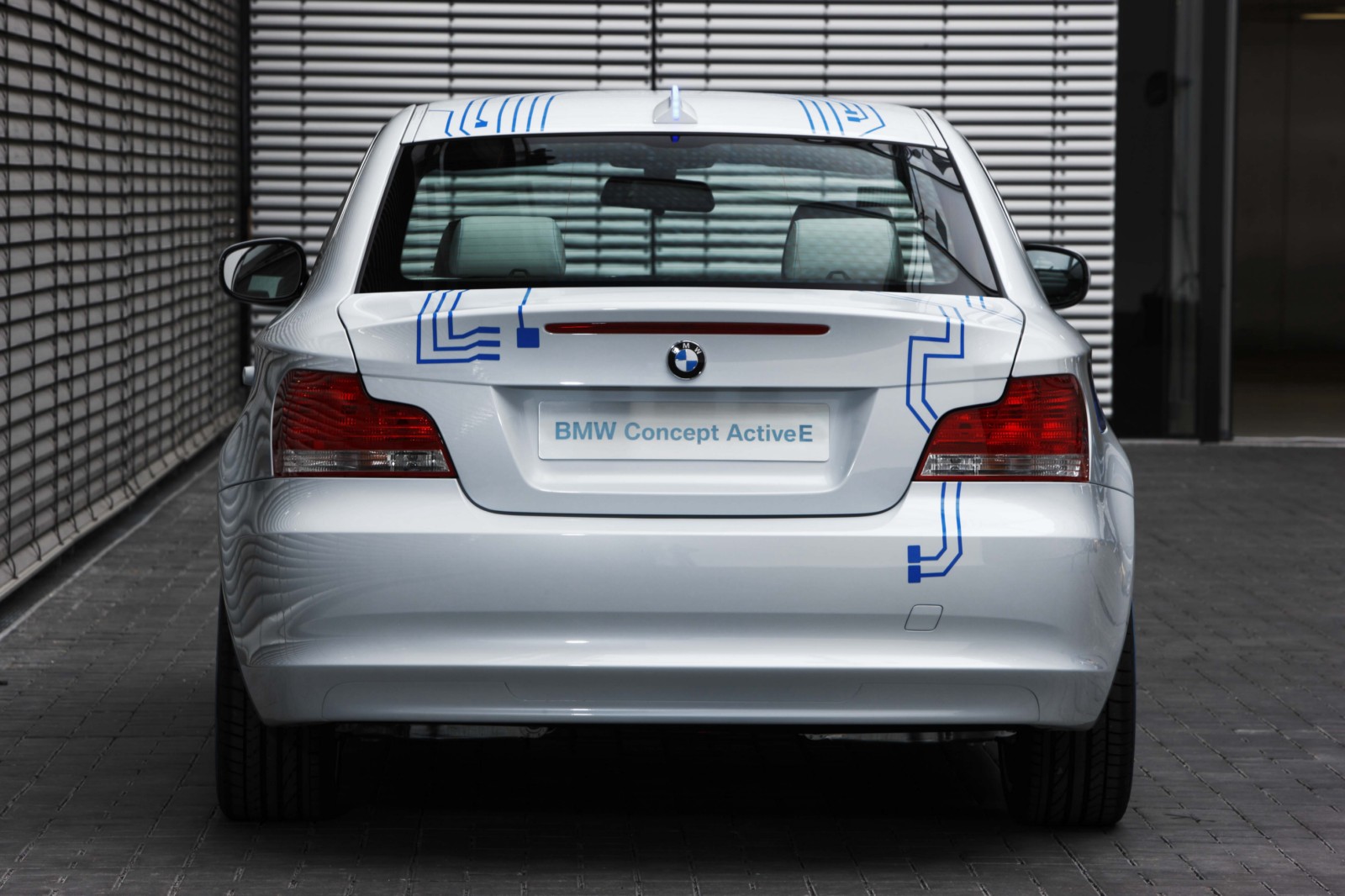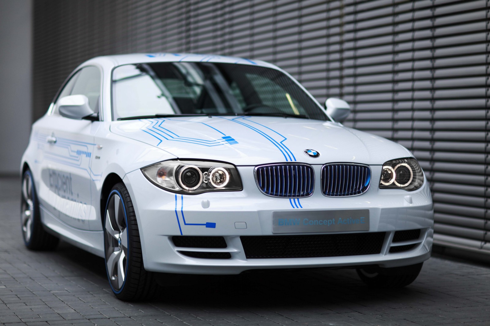 Design: unmistakably a BMW 1 Series Coupe.The technology of the BMW Concept ActiveE is highlighted through unique design features. The BMW Concept ActiveE is unmistakably based on the BMW 1 Series Coupe, well-known for its outstanding agility and efficiency. With its powerful proportions, the BMW Concept ActiveE also embodies an especially sporty form. Its side view is dominated by the striking shoulder line and the short overhangs. In addition, the BMW Concept ActiveE boasts striking light alloy wheels which are aerodynamically optimized. The distinctive appearance is partly created by the concept-specific rear apron which is completely closed, demonstrating that the vehicle is entirely emissions-free due to the lack of an exhaust system. There is a recognisable differentiation from the production model of the BMW 1 Series Coupe with the body finish in Liquid White metallic, as well as graphic elements derived from printed circuits in Electric Blue on the hood, doors, roof and trunk lid, as well as the lettering “ActiveE”, “eDrive” and “Efficient Dynamics” on the doors and side panels. The following elements also reflect the special character of this electrically powered vehicle: a blue illuminated charging connection behind a translucent filler cap, a glowing blue roof fin and kidney rods finished in blue. Blue rings on the tyres also make for a visual enlargement of the 18-inch wheels.