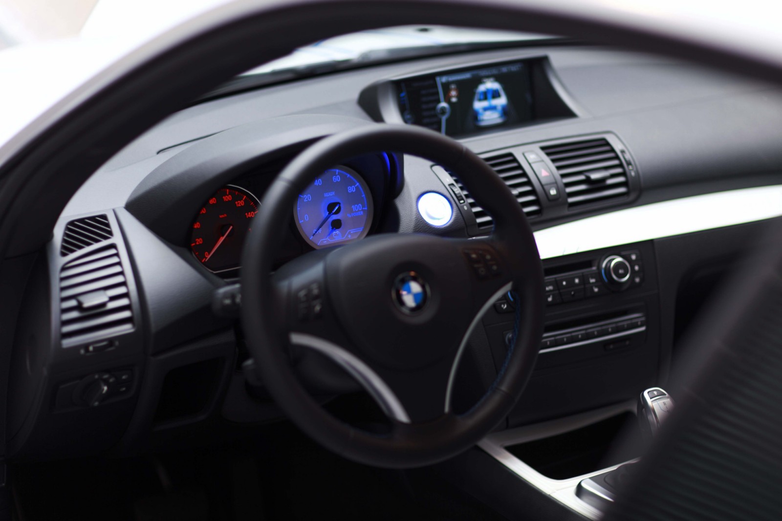 In the interior, individual details highlight the distinctive style of the study and are functionally associated with the electric drive. Among other things, the interior of the BMW Concept ActiveE has special leather seats with embossed graphic elements and blue contrasting stitching. The instrument panel and door trim panels have strips in Liquid White. The decor strip in the instrument panel is finished with a three-dimensional rear-lit ActiveE graphic. The blue illuminated start/stop button and the selector lever knob emblem in White/Blue round off the overall graphic concept. What is more, the instrument panel and the central display have been enhanced to monitor the electric drive.