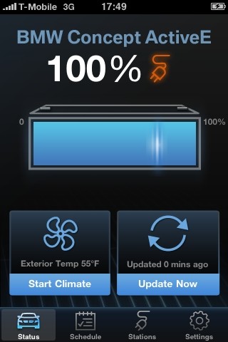 In addition to the intelligent remote controlled operation of the auxiliary heating and air conditioning, BMW ConnectedDrive offers additional services specially developed for the BMW Concept ActiveE. The main focus here is on the user-friendly and practically oriented relay of precise information on the condition of the vehicle. No matter how far he is from the vehicle, the driver can obtain details of the charge status of the lithium-ion battery and the range of travel this permits. The remote control functions also provide support in searching for a nearby public charging station.The configuration of the remote control functions is specifically oriented to use scenarios arising in everyday traffic. For example, the driver can go shopping or eat at a restaurant while the vehicle is supplied with electrical current at a charging station. Within a very short time the driver can obtain information on the current charge status of the batteries by mobile phone. The driver can also determine how much charging time is required for the batteries to achieve sufficient energy capacity for the trip home, thus allowing other activities to be planned. Providing sufficient charge is available, the driver can also activate the heating and air conditioning during an excursion when the battery is fully charged and the vehicle is connected to the power supply. In this way a pleasant temperature can be generated inside the car within just a few minutes and in good time before setting off.