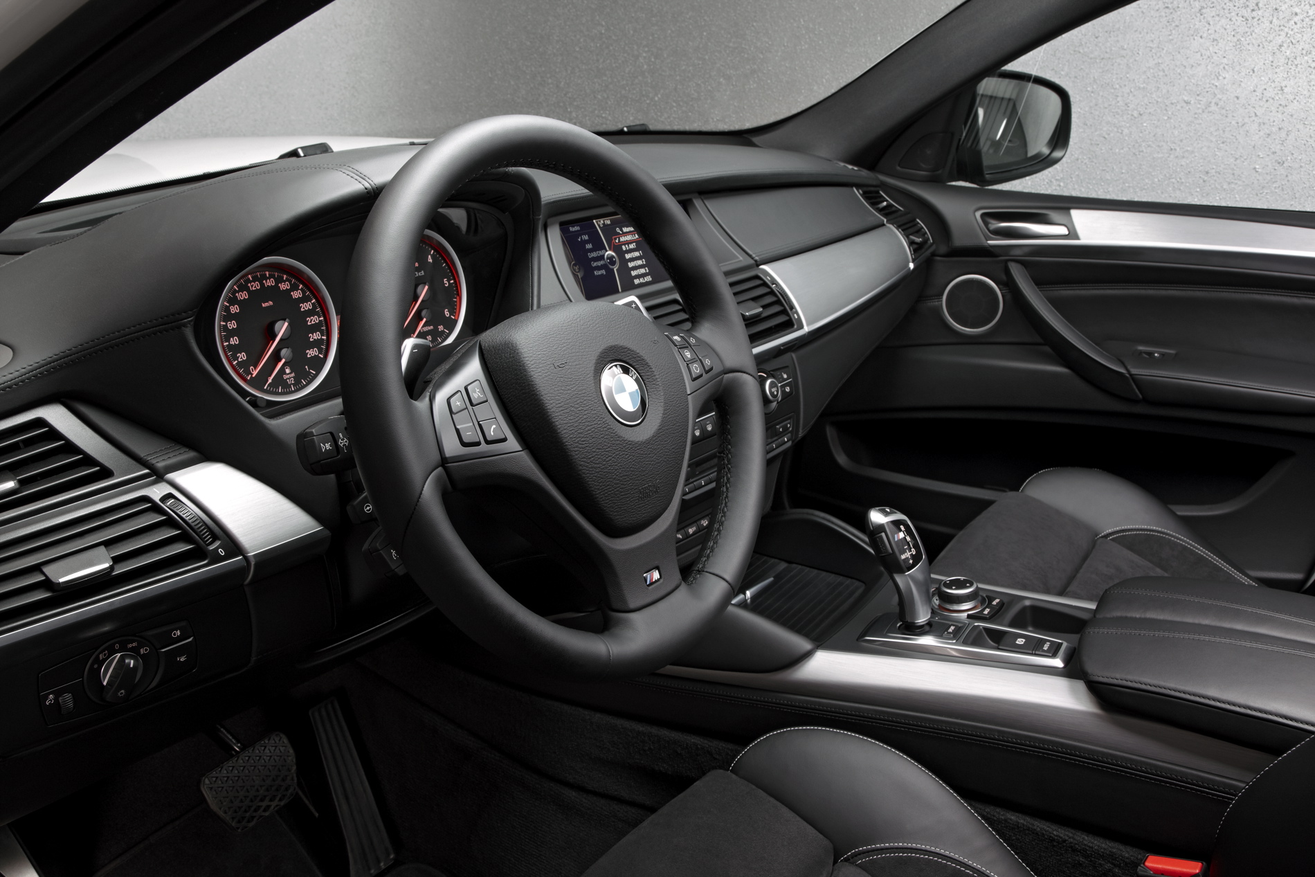 Exclusive exterior and interior design features for the two BMW M Performance Automobiles based on the BMW X models provide clear visual differentiation, optimised aerodynamic balance and enhanced driving pleasure. Its powerful presence and distinctively three-dimensional contours make the body-coloured front apron a genuinely eye-catching item. To optimise the supply of cooling air to the power unit, the spaces normally reserved for foglamps on regular BMW X models take on a new role as air intakes, and these large surfaces offer a tantalising hint of the engine power lurking behind the scenes. Horizontal bars in the colour shade Ferric Grey metallic course across their surface. The race-inspired air-channelling flaps sited below the side air intakes optimise the cars’ aerodynamic balance at high speeds.