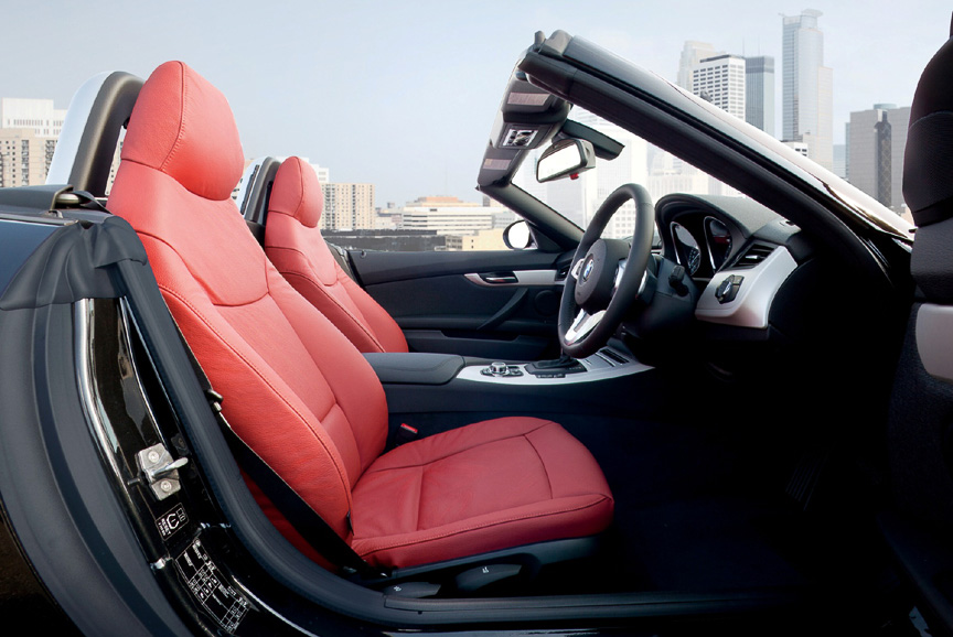 The interior design sports Coral Red Kansas leather seats, a standard feature on all the Silver Top Edition Z4s.