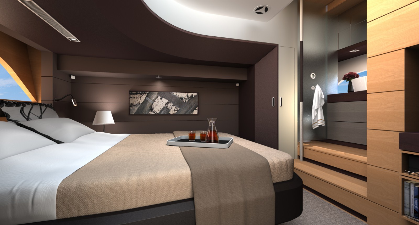 The internal areas of the Intermarine 55 were conceived from the theme “open horizons”, providing maximum openness and space. Inspired by modern architecture, the spaces are full of natural light and light reflexions, creating a warm and comfortable environment. The big windows in the salon, cabins and even in the bathrooms allow an open view to the sea. The salon door offers perfect integration with the stern area thanks to its wide opening via three door panels. Since Brazil’s climate allows for optimal time on deck, the design included open transitions for increased functionality.