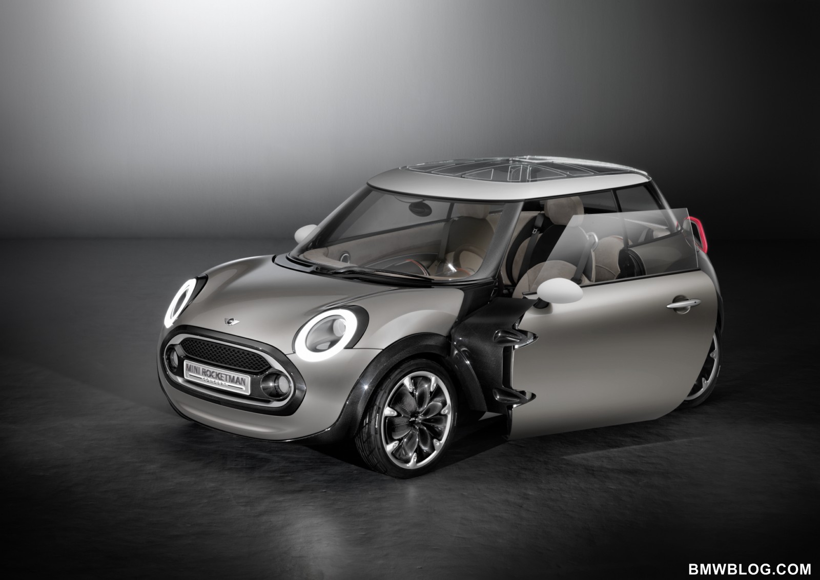 MINI Rocketman makes use of lightweight design principles and an interior geared to maximum driving fun and unbeatable variability. A carbon spaceframe construction, whose striking surface structure is visible at the front end of the car, around its doors and in the interior, forms the basis for a weight-minimizing construction. Wide-opening doors with double-hinge joints and integrated sills facilitate entry into the MINI Rocketman Concept.