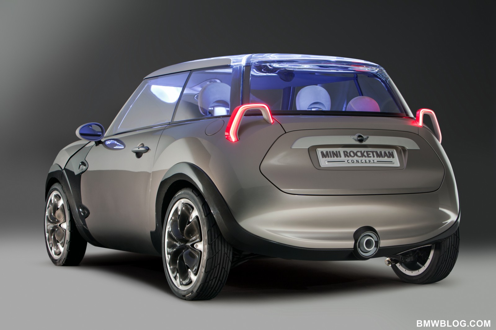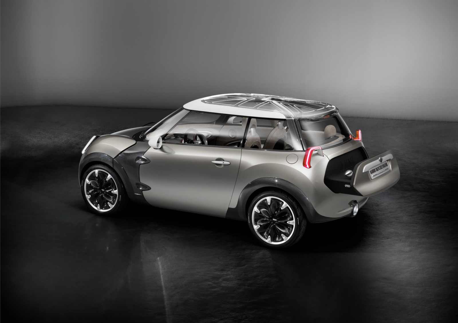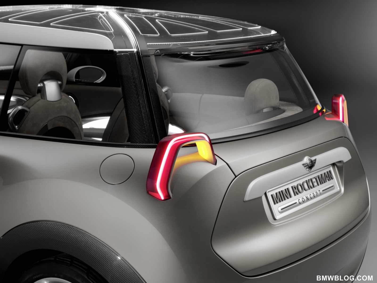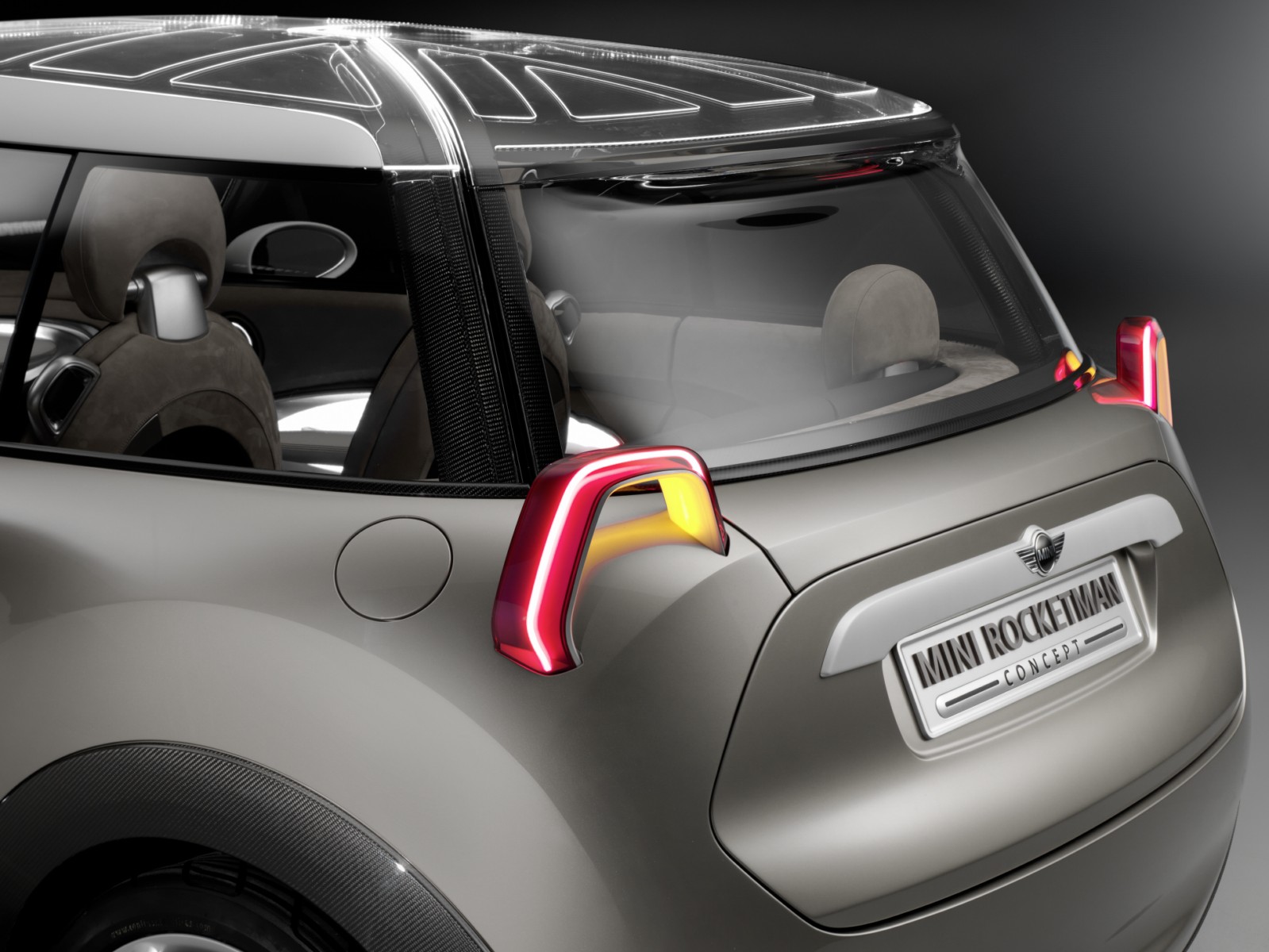 Projector-style rear lights, transparent and illuminated glass for the roof.The rear lights of the MINI Rocketman Concept have a trapezoidal stirrup design – into which all the light functions are integrated – and work using projector technology. The lamp assembly projects the rear and braking light and the light for the direction indicators onto the car body. The high-output LED units used for the lights ensure that even this indirect illumination concept produces the accustomed intensity of light that
