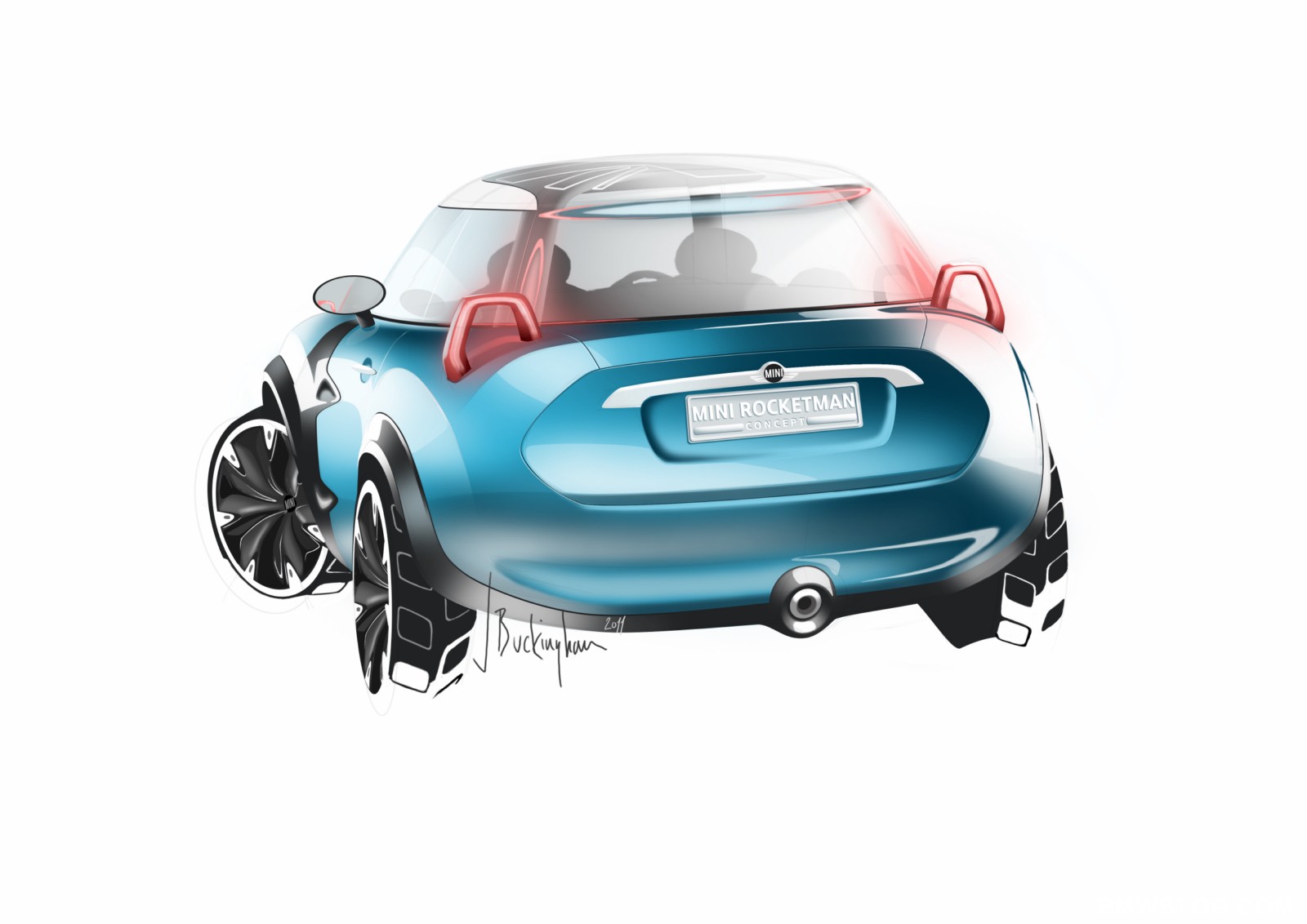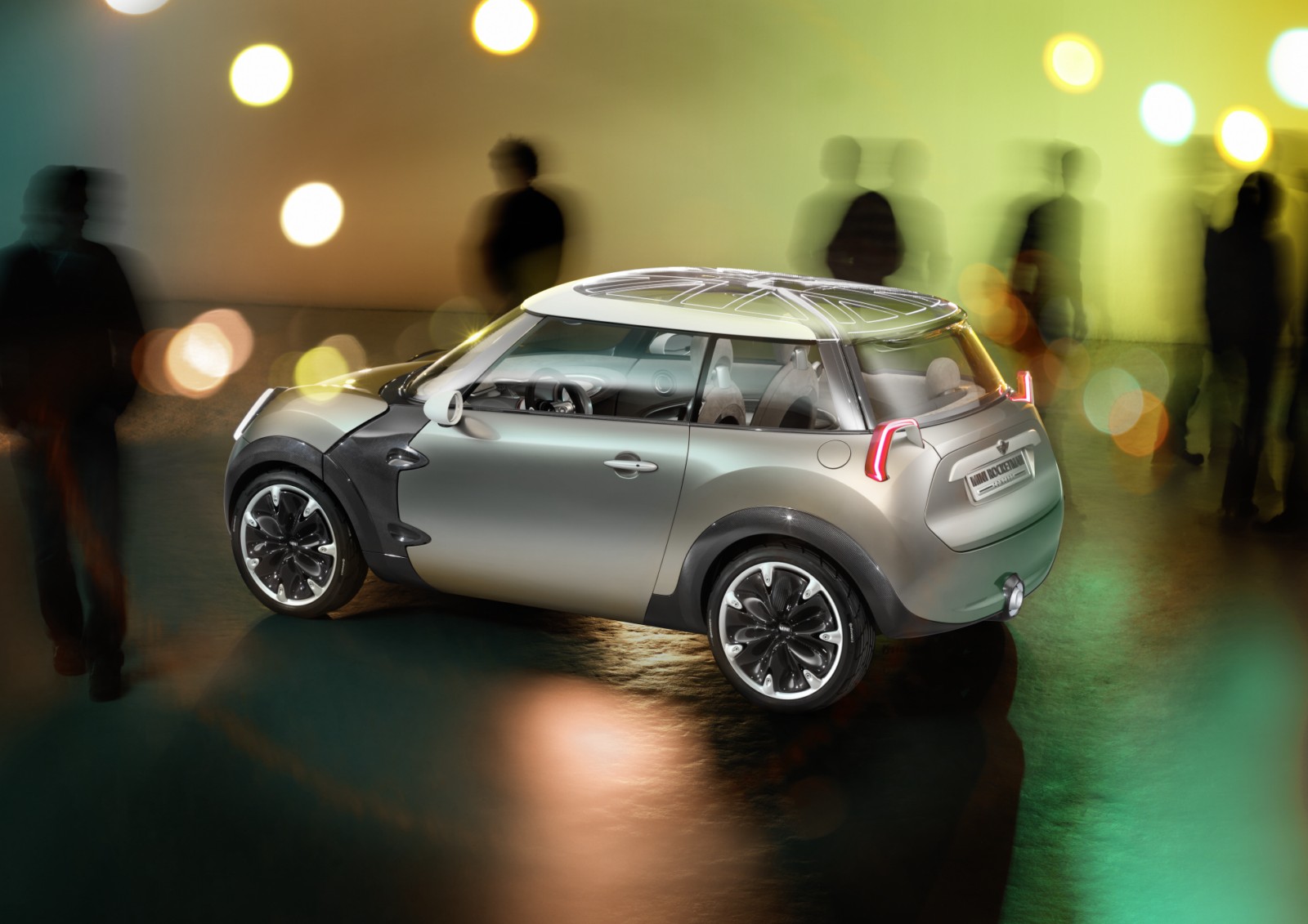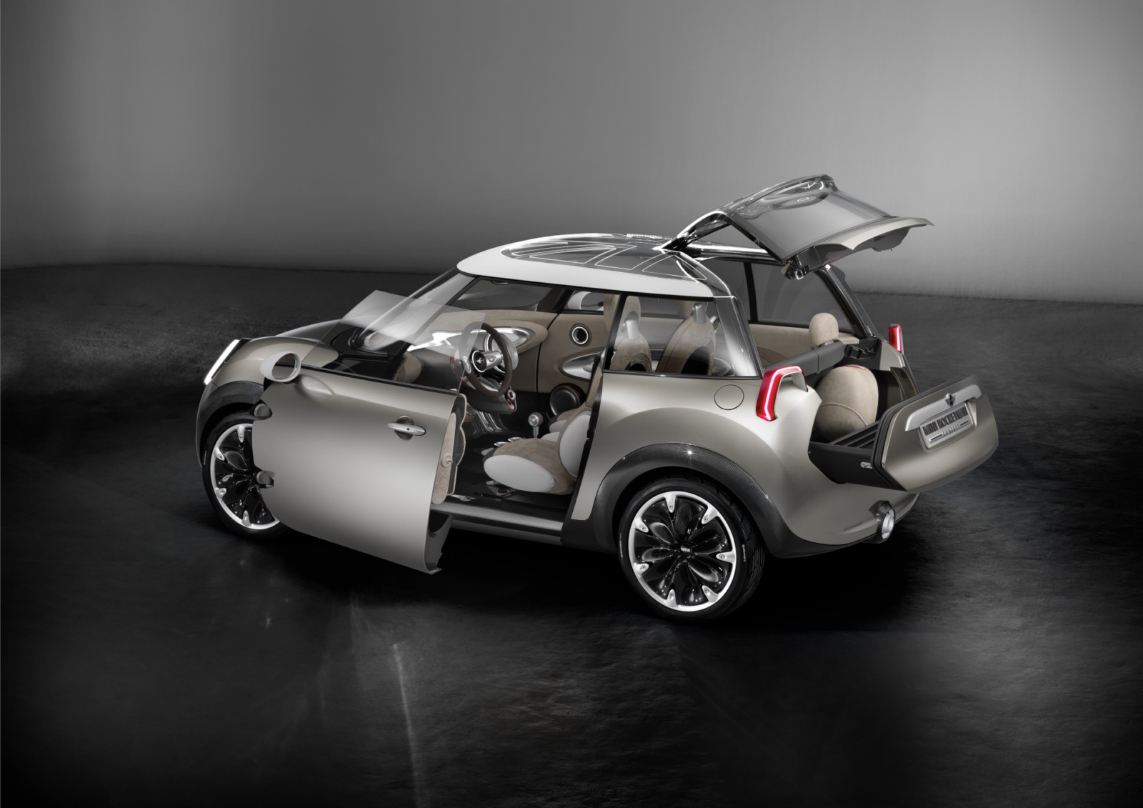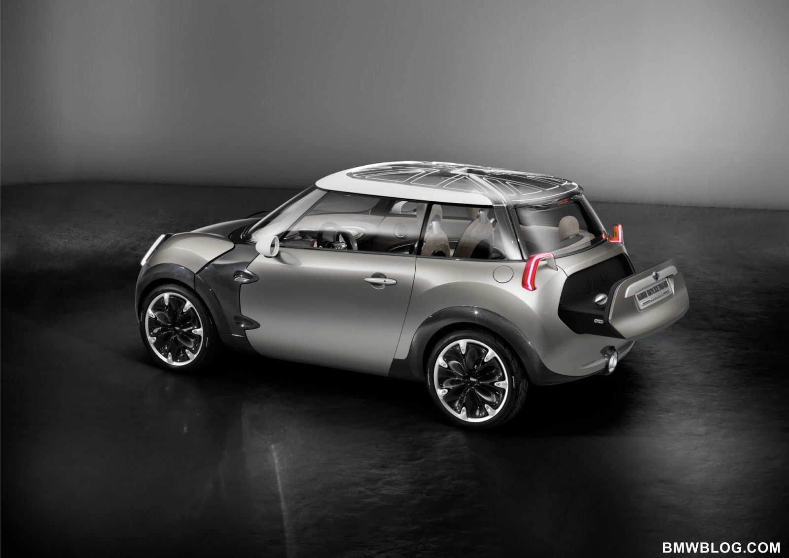 Projector-style rear lights, transparent and illuminated glass for the roof.The rear lights of the MINI Rocketman Concept have a trapezoidal stirrup design – into which all the light functions are integrated – and work using projector technology. The lamp assembly projects the rear and braking light and the light for the direction indicators onto the car body. The high-output LED units used for the lights ensure that even this indirect illumination concept produces the accustomed intensity of light that