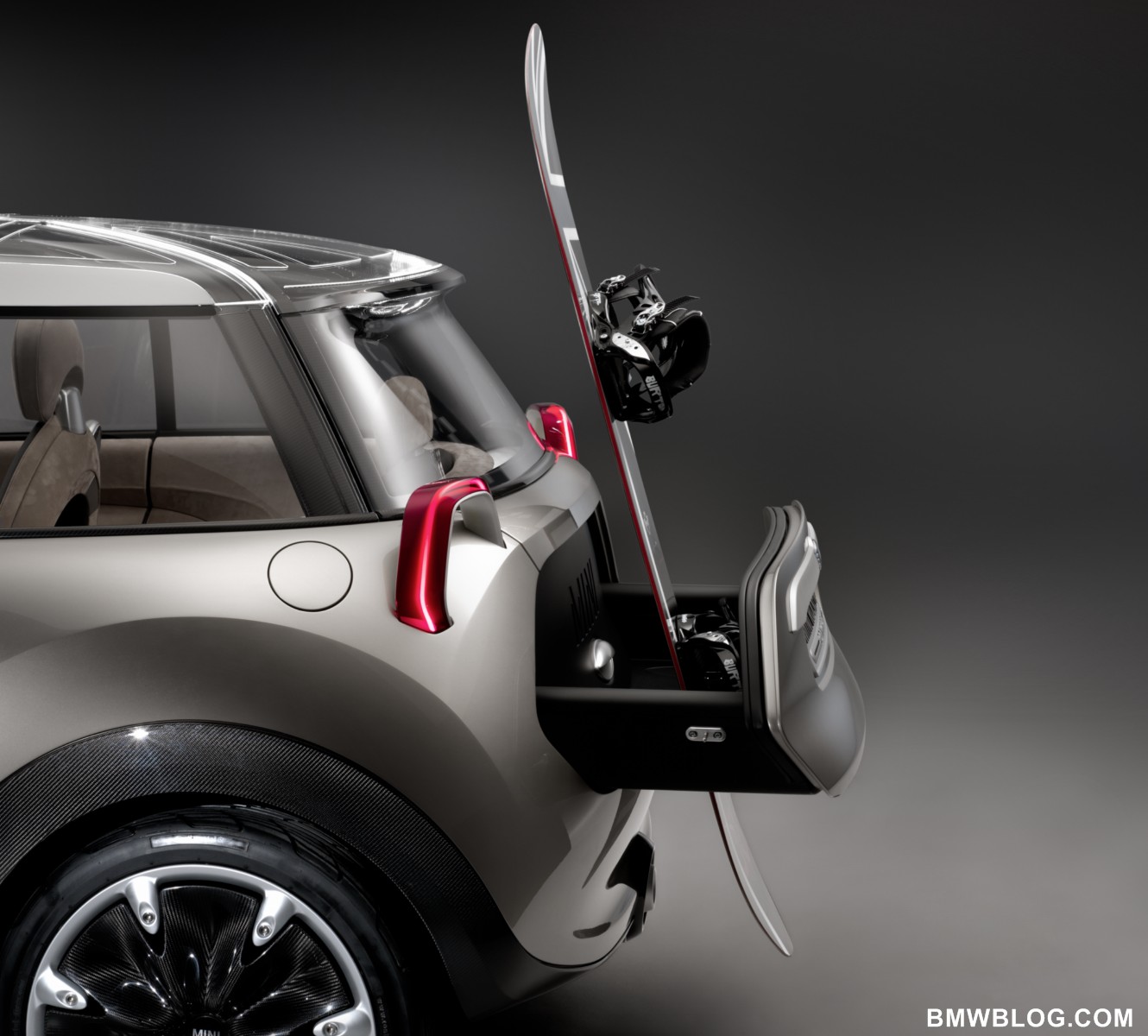 time to start loading up the gear.An intelligent folding mechanism makes it possible to lock the cargo drawer of the MINI Rocketman Concept either higher up or further in towards the passenger compartment, as the loading scenario demands. This allows loads to be transported out of sight and protected from the weather. If required, items can also be loaded through into the passenger compartment. In addition, the open-top cargo drawer can also serve as a rear luggage carrier. Here, purpose-built inserts make it easier to transport snowboards and other bulky items of sports equipment. Added to which, the glass tailgate, which extends well into the roof, helps to enhance loading flexibility. It is connected with the body via a centrally positioned hinge with integrated gas strut system, which also allows it to be opened when the rear carrier is loaded with gear.