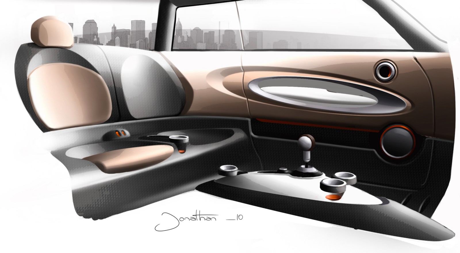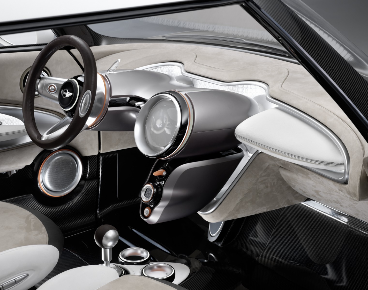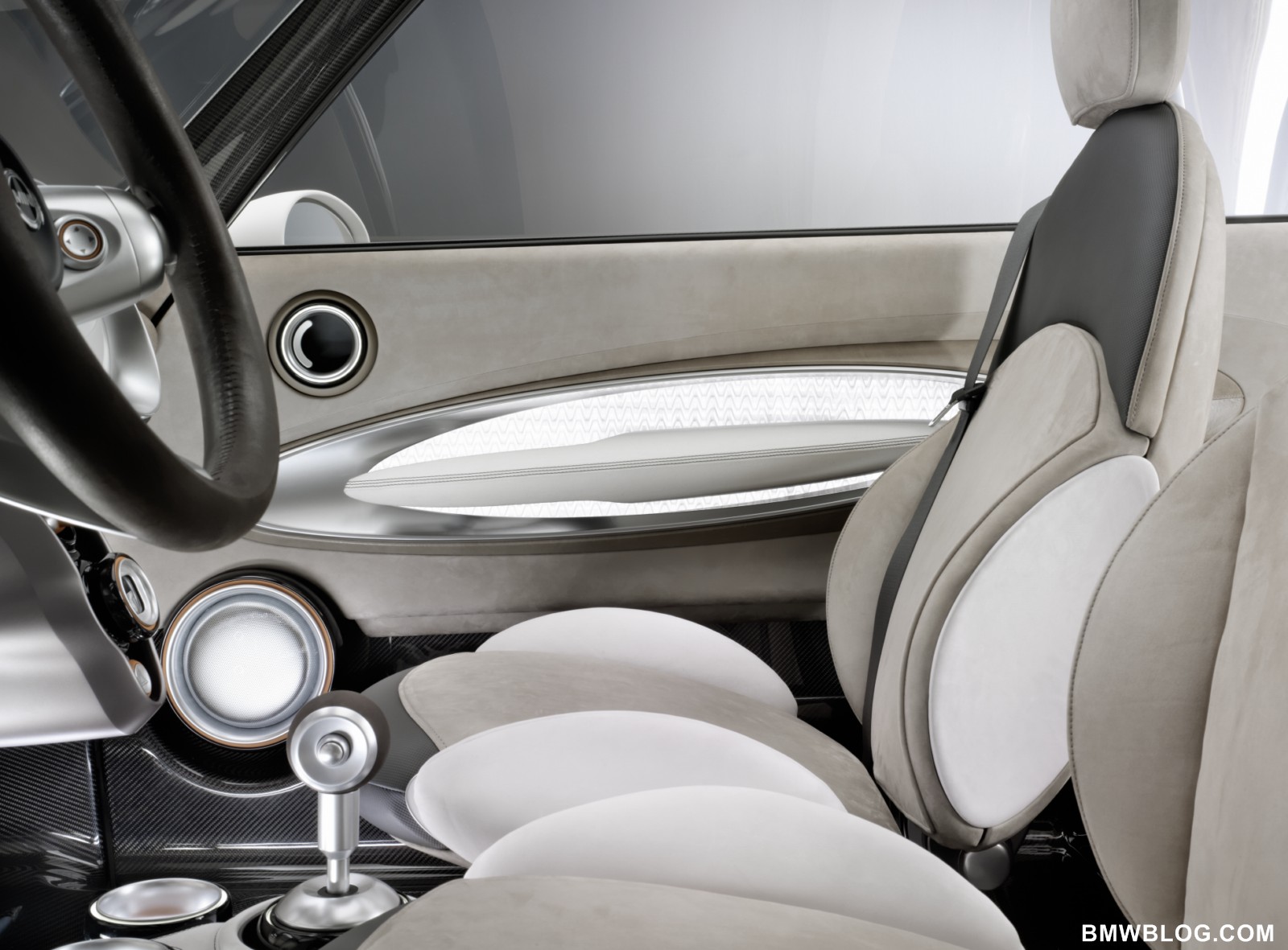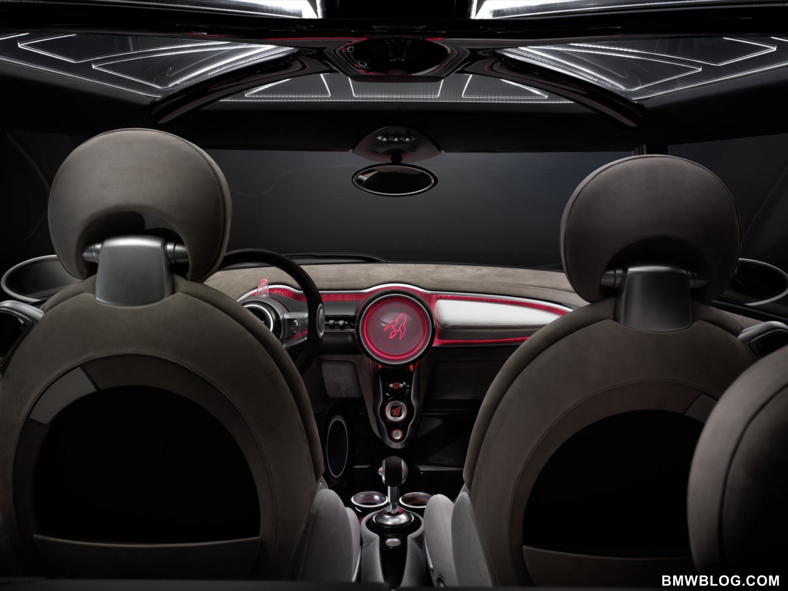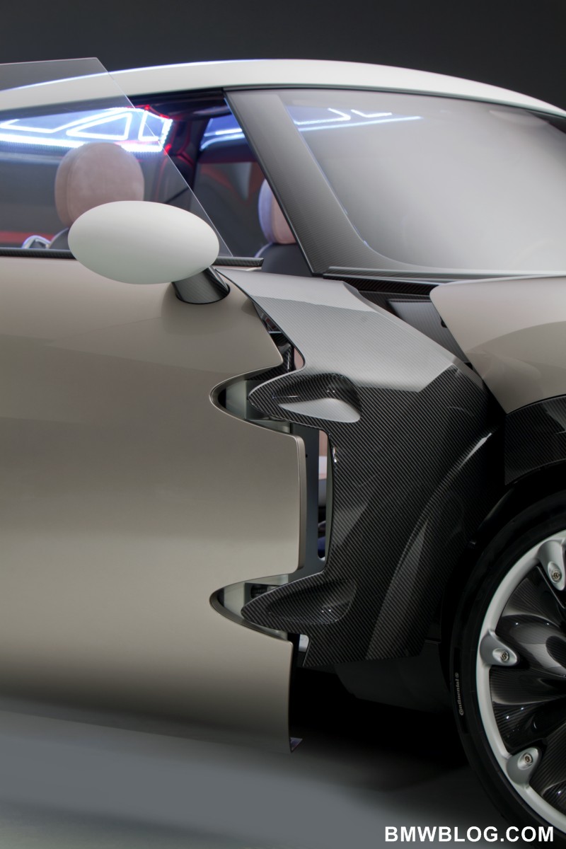 this end, the carbon structure of the body frame has been left exposed in the footwells and around the center console.A fresh interpretation of customary MINI design features emphasizes the further development of the brand’s characteristic design language inside the study car as well. The door panels house the door pulls and the stowage compartments, which feature trim elements whose elliptical form reaches past the B-pillar into the rear compartment. The surface design offers a stylistic nod to the variable division of space and shared driving experience provided by the MINI Rocketman Concept interior.