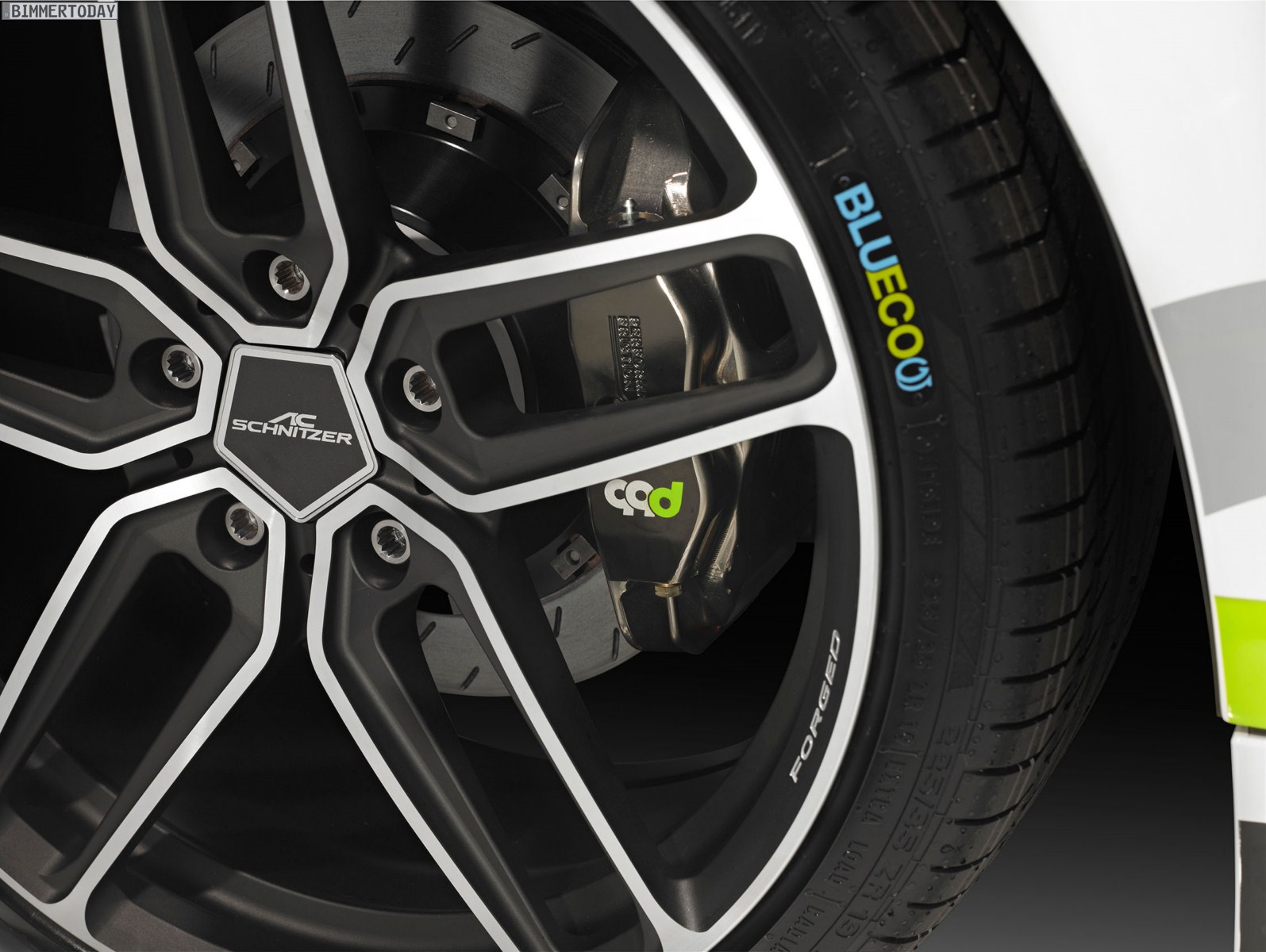 The Continental BLUECO tyres size 225/35*19 were a special concept development in conjunction with AC Schnitzer. These tyres help optimise the rolling resistance. The design is a refinement of the Conti Sport Contact 5P, and allows sporting driving thanks to its high cornering stability and ZR speed rating of over 240 km/h.