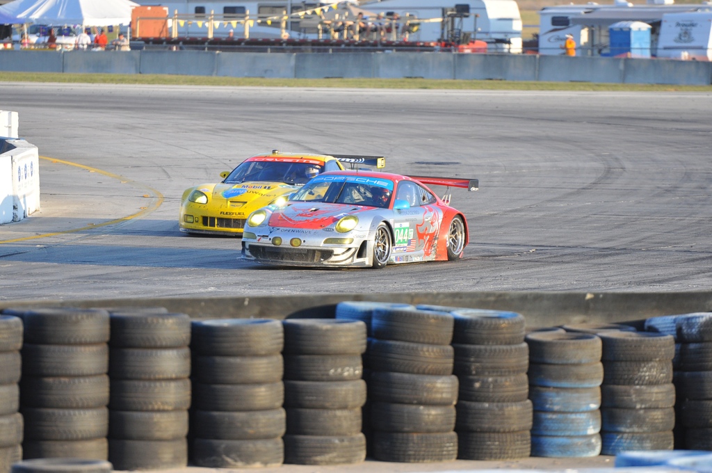 After the start of the race, the GT segment turned into what many expected: a very tightly packed sprint race. Dirk Werner qualified 3rd in GT and Herr Muller in 4th – just behind the Chevrolet C6.R in 2nd and the AF Corse Ferrari 430 GT in 1st. With a record number of cars in the field, many teams anticipated that after the 10:30AM start there would be quite a few yellow flags resulting from racing incidents. It would seem that many of those predictions were correct when just a few hours in, Patrick Long hit a rough patch of track in turn 17 – throwing him directly into Magnussen’s Corvette C6.R. Dirk Muller also had an incident where he collided with one of the Jaguars while braking into a corner – Muller also made contact with one of the LMP cars early on. A few hours later, a Porsche GTC car would spin off and hit the tire wall in turn 17 less than 100 yards from where I was standing to shoot photos – racing is still dangerous, folks!