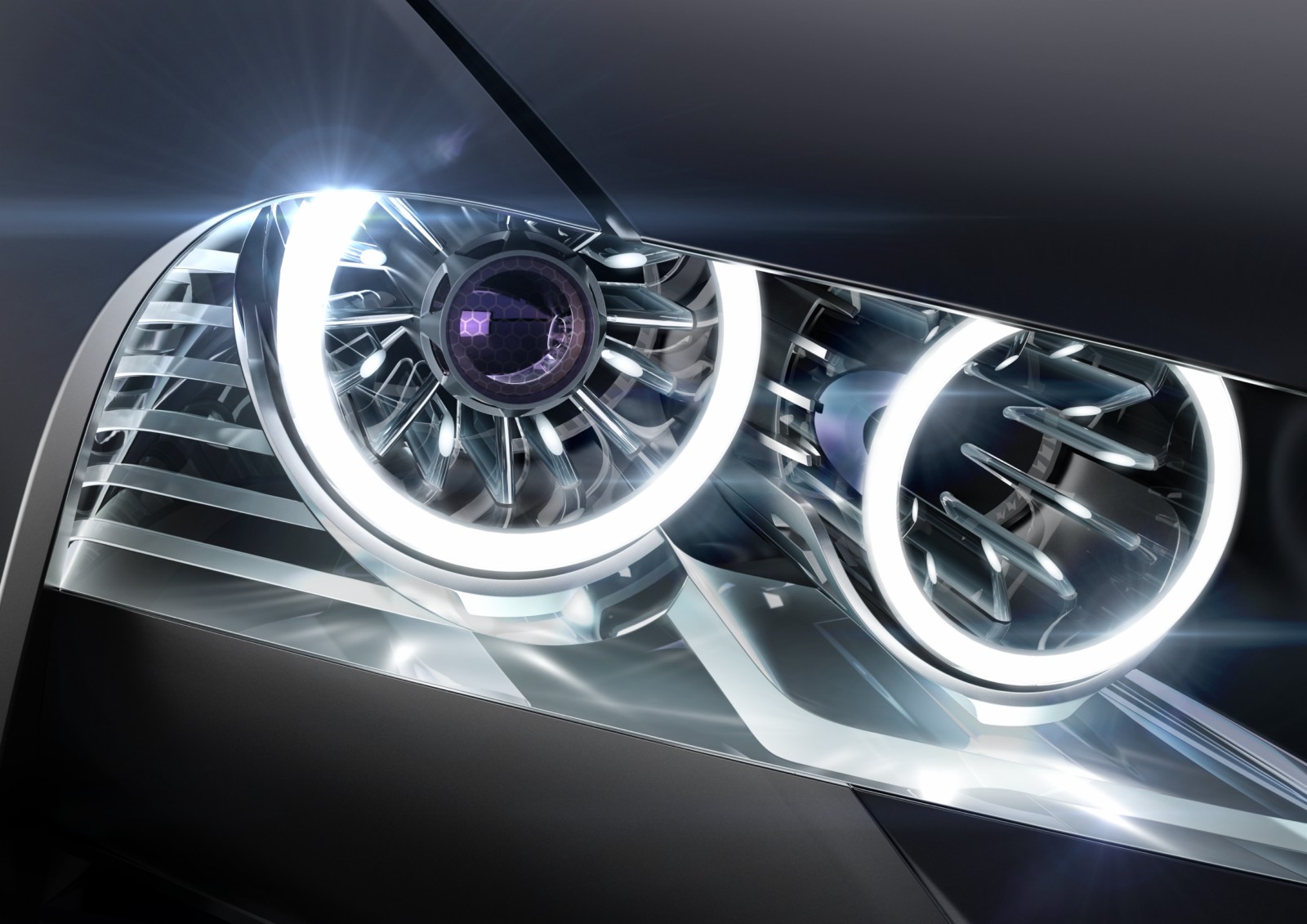 At the front, the full LED lights, so the daylights are coming from the corona rings and since now the center of the headlight is empty, we have placed in there the Night Vision cameras. Normally the cameras are behind the front-grille. So now, with ConnectedDrive, the information flows to the driver and since we now have two Night Vision Cameras, you get the 3D picture.