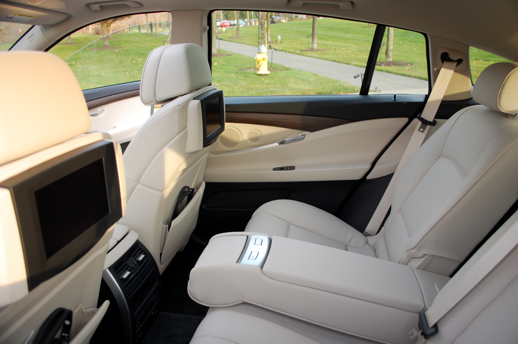 However, the best part of the interior is the rear seat. Available as a 3-person rear seat or a 2-person bench with power rear seats, this is quite a comfortable place to be. As the 5 GT is based on a F01 750i platform, you’re privy to the same rear seating capacity and overall interior space. In the rear with the partially reclining seats, I found a very comfortable place to spend my time. With optional DVD players in the rear seats, acres of leg room (I’m 6′4 and my feet were nowhere near the front seats) you start to wonder – “why would I pick a 750i over the 550i GT?” Especially when the model we tested is anticipated to come in somewhere in the mid-high $60,000 range, well below a base 750i. While most owners will never spend a lot of time being driven in their own car, this car made a compelling case for asking my fiance to start driving me around when we have to run errands. Add to the comfort the very open, airy feel of the greenhouse and you’ll likely not want to get out of the car once you reach your destination.
