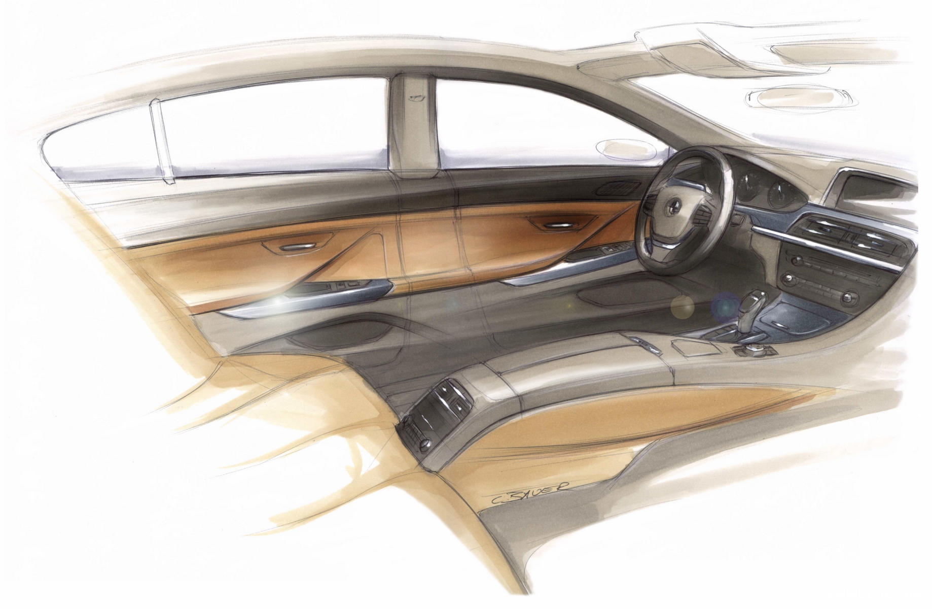 From the front wheel arch, a sharply pressed line drops diagonally down towards the rocker panel at an approximate 45 degree angle. This character line adds a dimension of movement to the car, even when it’s parked. As your eye moves front to back, it is also forced to accelerate, looking top to bottom. We love this character line since it has grown on us after spending time with the 6 series cabriolet and coupe. As you circle the car, a strong shoulder line originates at the front side air vent, and continues toward the rear of the car until flowing into the rear taillight fixtures. The door handles are transected by this character line, and this makes for a “cleaner” side profile.