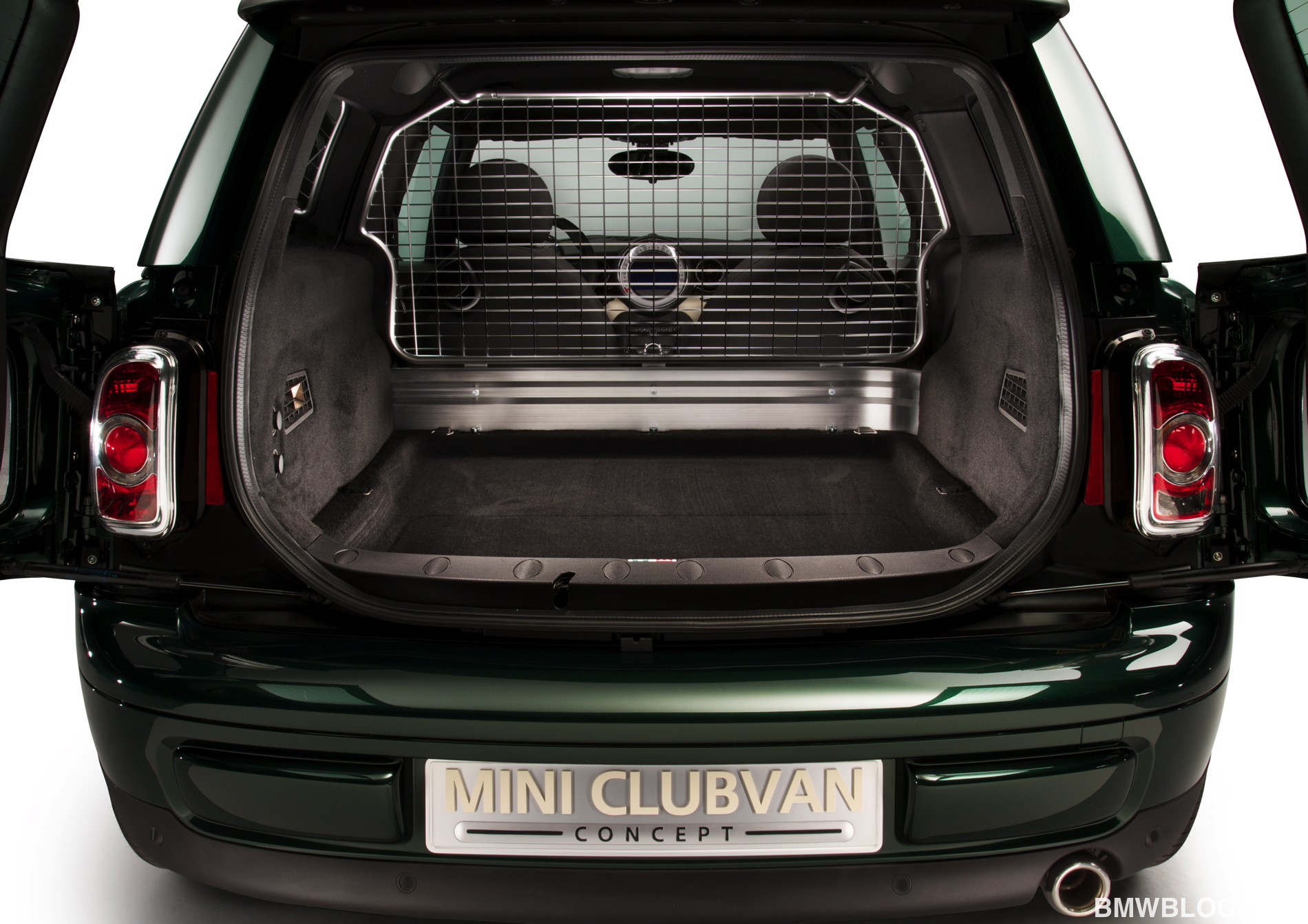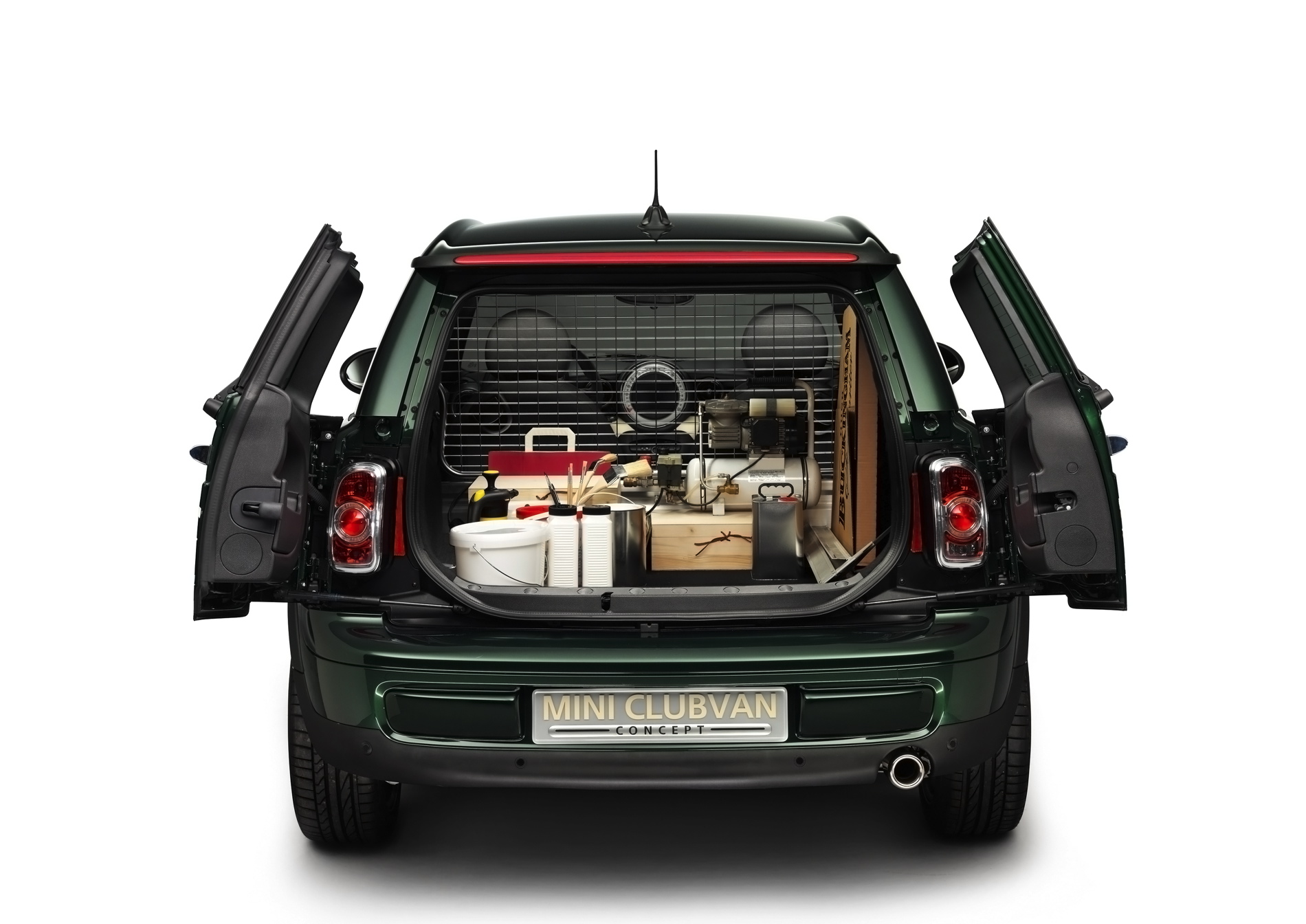 The MINI Clubvan Concept is finished in British Racing Green paintwork, which extends to the roof, C-pillars and exterior mirror caps. The rear side windows are opaque with polycarbonate sections and are painted in the car’s body colour. The rear doors feature heavily tinted glass making it difficult to see into the load compartment.