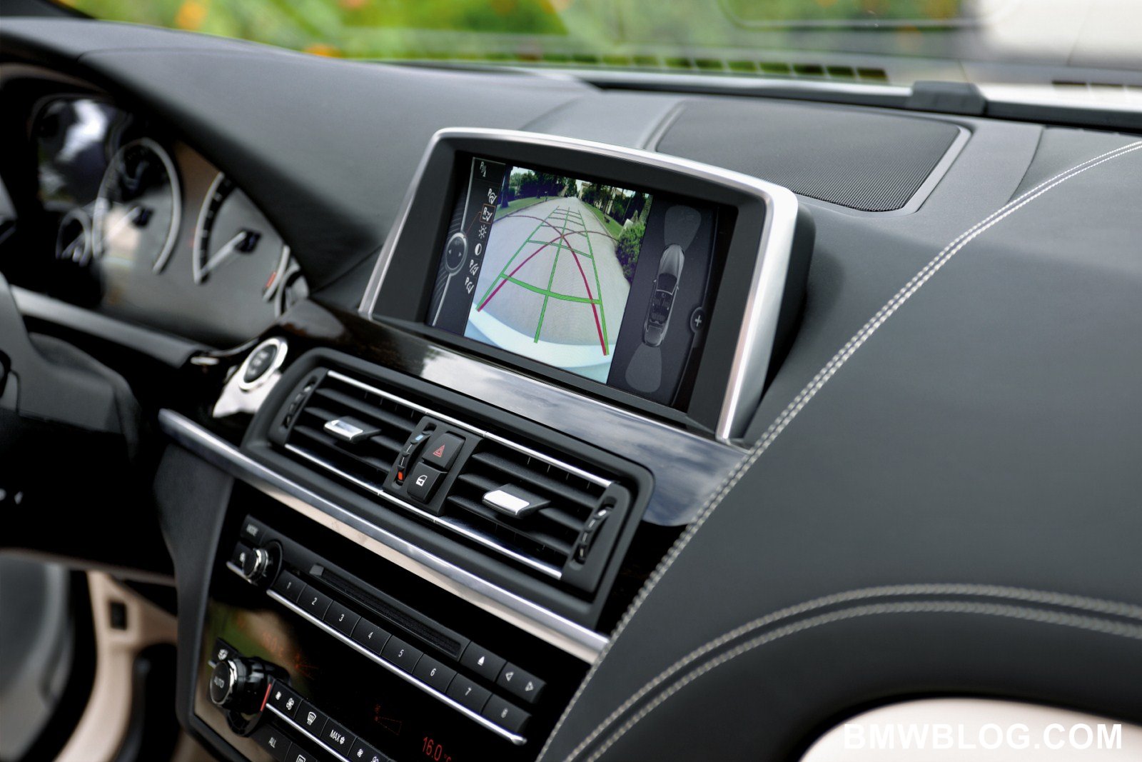 To supplement the standard Park Distance Control, which uses ultrasonic sensors to monitor distance from objects in front or behind, the new BMW 650i Convertible also features a standard rear-view camera. The camera is integrated in the trunklid under the BMW “roundel” badge, which protects it from dirt. When the rear-view camera is activated, the roundel badge pivots up out of the way to expose the camera lens. The perspective-corrected color images are relayed to the Central Display. Superimposed on the images are interactive tracking lines which indicate the optimal steering angle for parking, as well as the tightest turning circle.